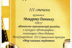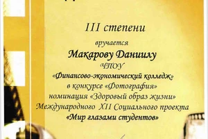 По итогам работы жюри в конкурсе «Фотография» две работы нашего студента Даниила Макарова, заявленные в номинациях «Моя Родина» и «Здоровый образ жизни», были отмечены дипломами III степени.Поздравляем Даниила! Желаем творческого вдохновения и успехов!