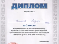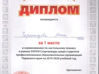 27 ноября в рамках XXXVIII Спартакиады среди ПОО Пермского края прошел турнир по настольному теннису. В соревнованиях приняла участие команда Колледжа, в составе которой были: Маликов Айдар, Мелихов Денис, Чернопазова Анна, Суркова Ксения. Руководителем выступил Бабиков Денис Валерьевич. В командном зачете Колледж занял 1-е место. В личном зачете Чернопазова Анна заняла 1 место, а Маликов Айдар занял 2-е место.