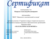 В конце прошлого года для учащихся колледжей и техникумов Перми и Пермского края прошел творческий конкурс «Математическая физика». Три студента Финансово-экономического колледжа проявили креатив и представили свои работы на конкурс.