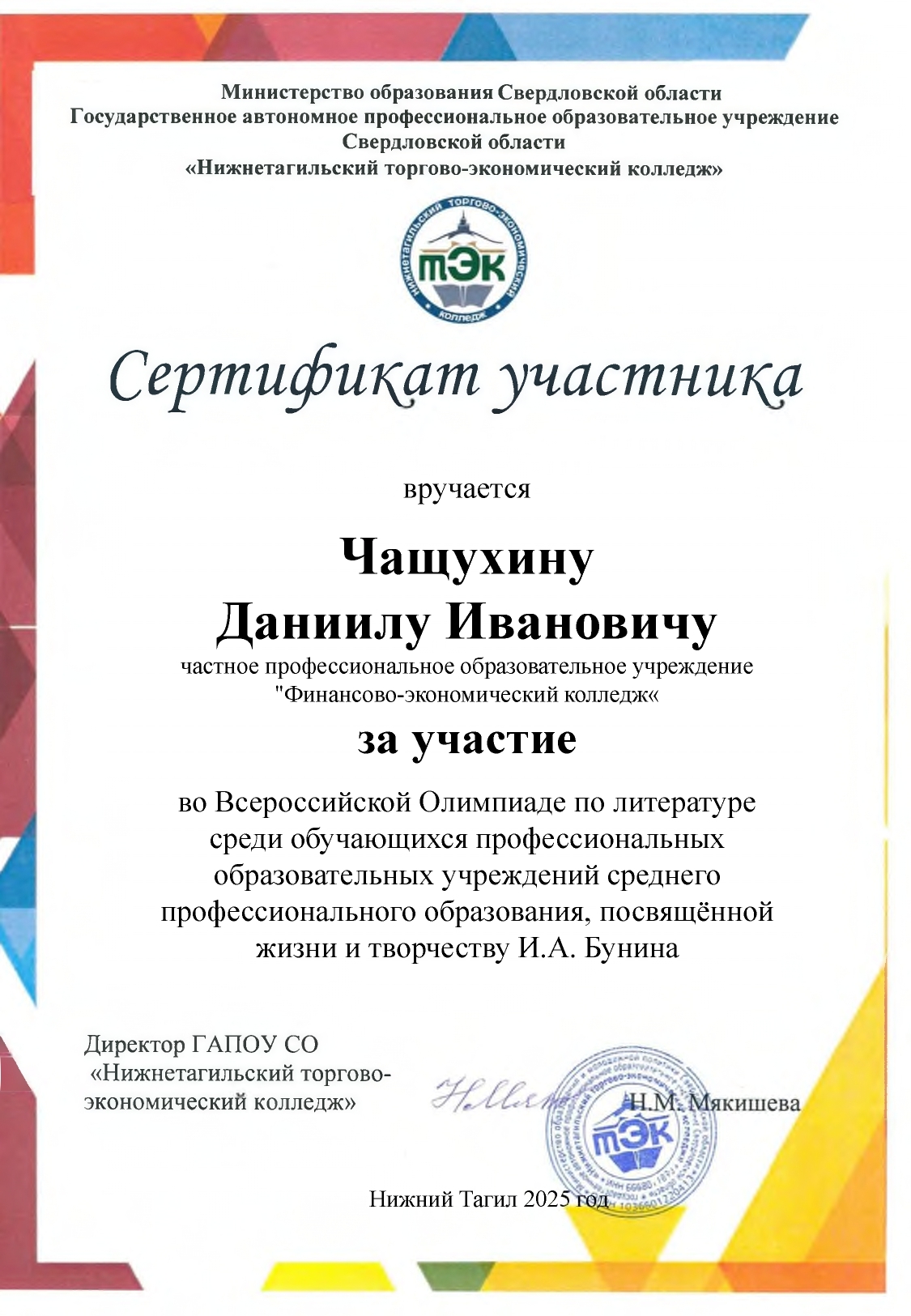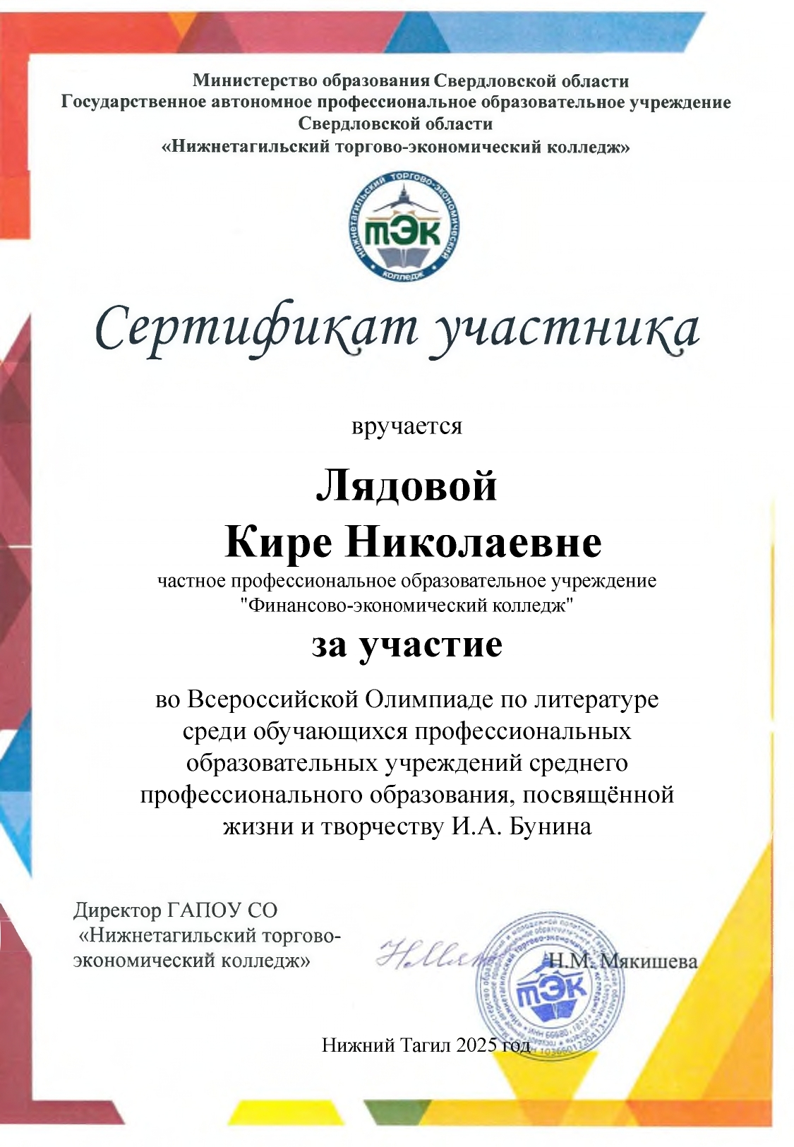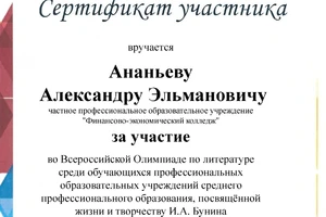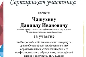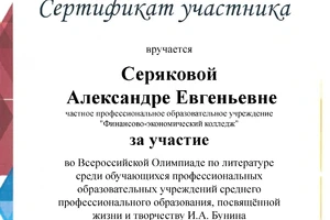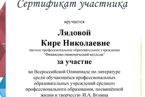 Студенты нашего колледжа Лядова Кира, Жданов Константин, Серякова Александра, Чащухин Даниил и Ананьев Александр приняли участие во Всероссийской дистанционной Олимпиаде по литературе среди обучающихся профессиональных образовательных учреждений среднего профессионального образования, посвящённой жизни и творчеству И.А. Бунина.