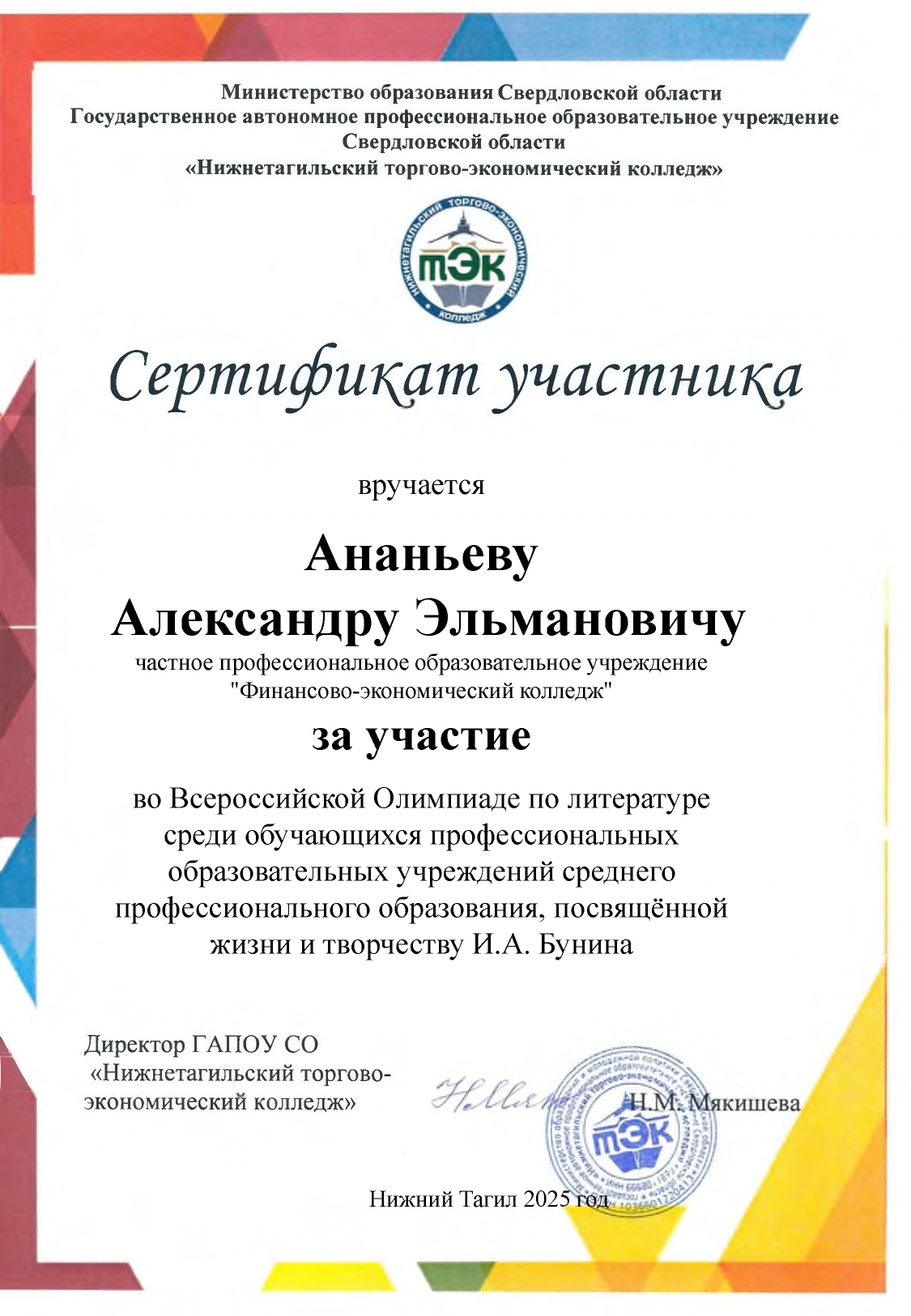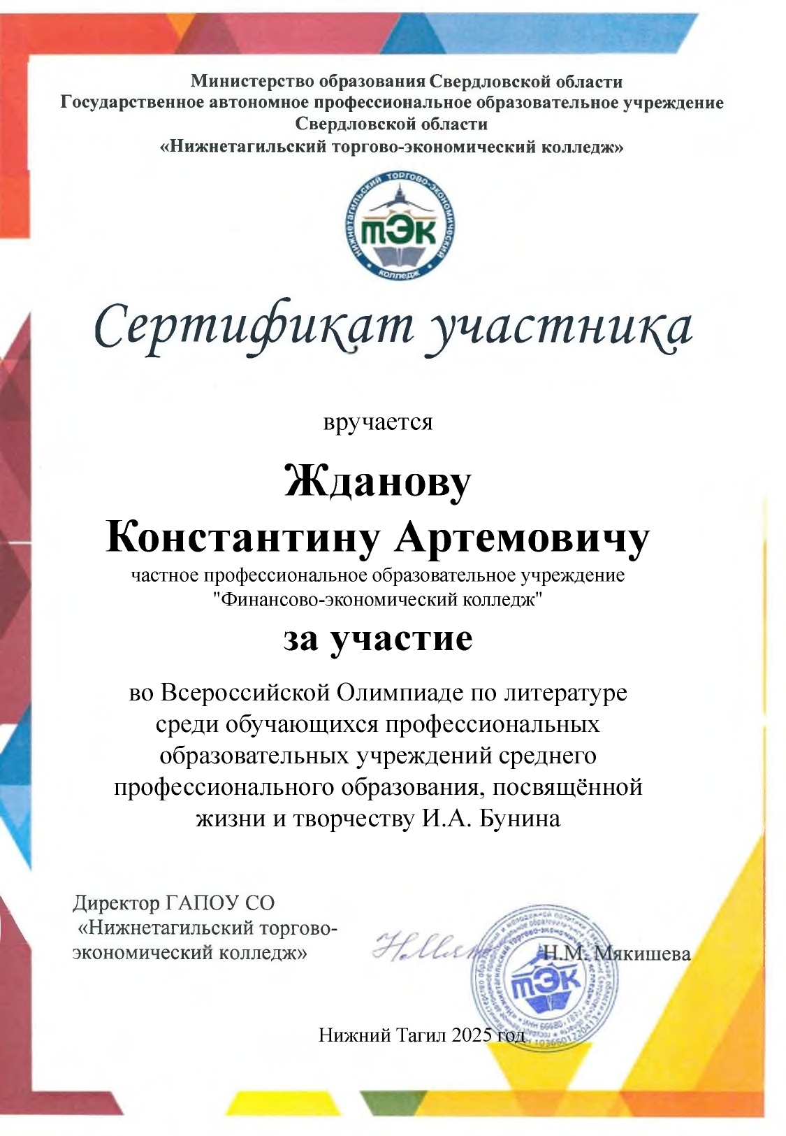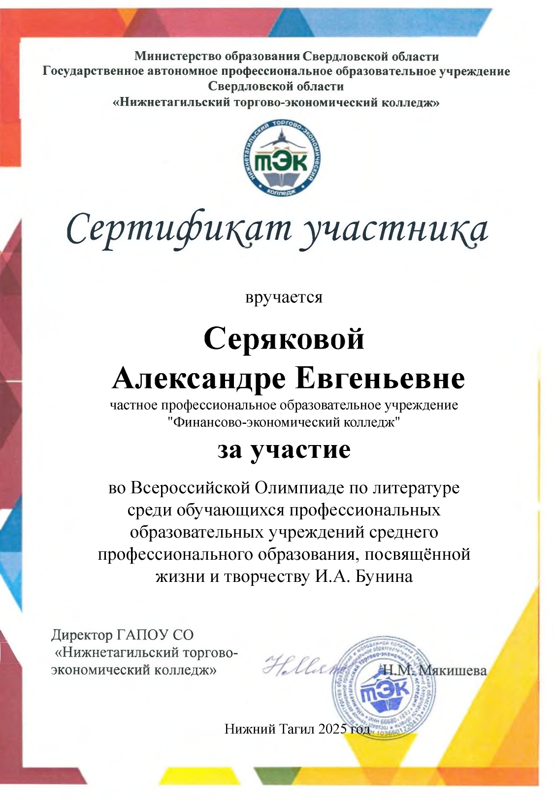 Студенты нашего колледжа Лядова Кира, Жданов Константин, Серякова Александра, Чащухин Даниил и Ананьев Александр приняли участие во Всероссийской дистанционной Олимпиаде по литературе среди обучающихся профессиональных образовательных учреждений среднего профессионального образования, посвящённой жизни и творчеству И.А. Бунина.