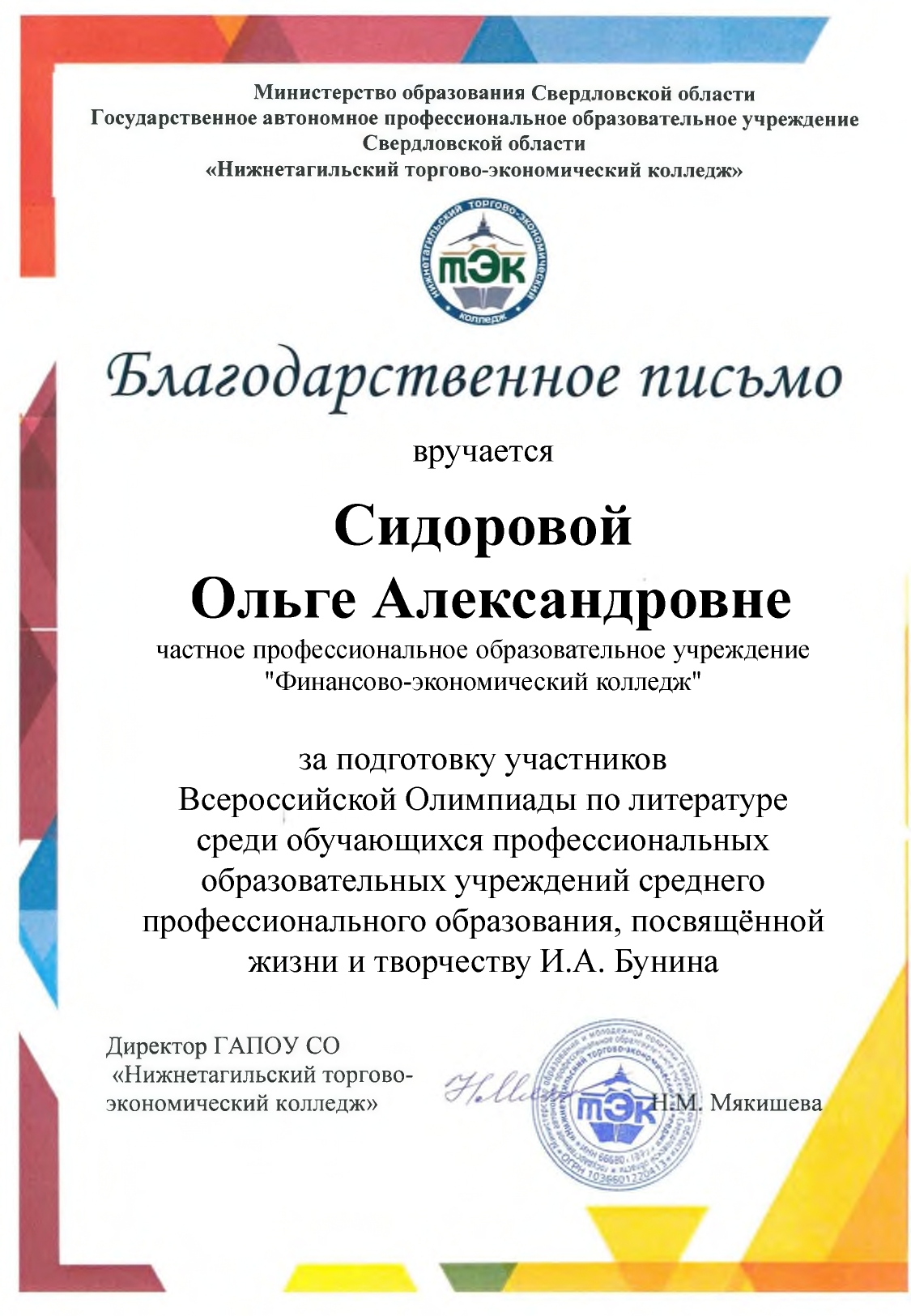 По итогам олимпиады студенты и преподаватель колледжа Сидорова Ольга Александровна награждены сертификатами за участие и благодарственным письмом!