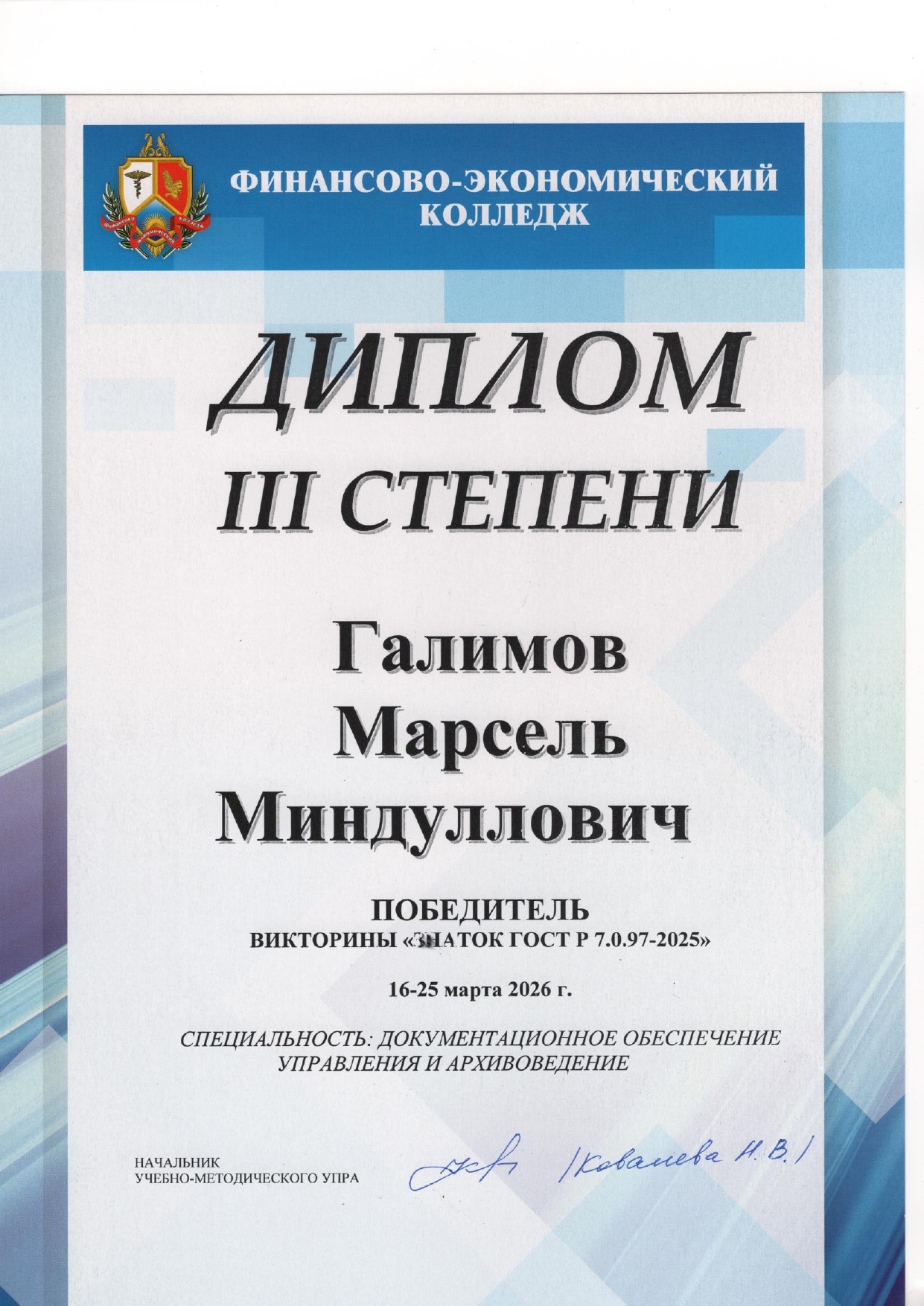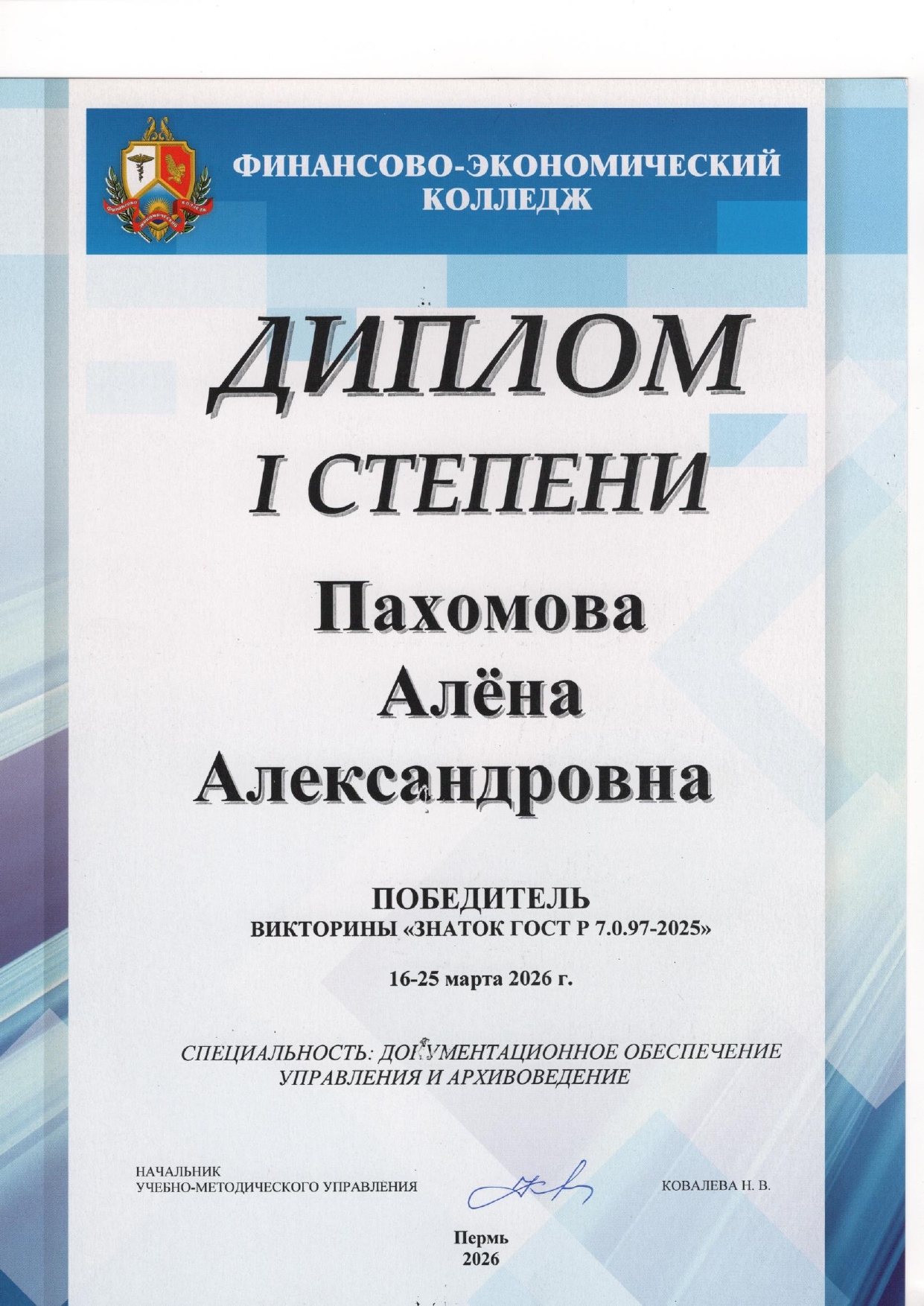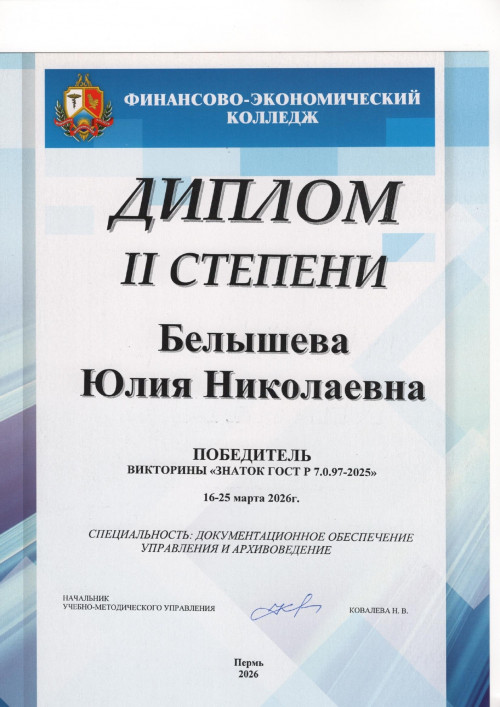 С 16 по 25 марта 2026 г. для студентов, обучающихся по специальности «Документационное обеспечение управления и архивоведение» была проведена викторина «Знаток ГОСТ Р 7.0.97-2025».