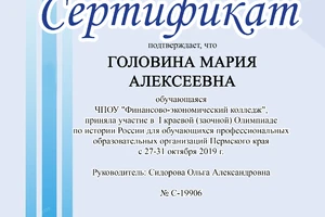 В октябре прошла I Краевая заочная олимпиада по истории России. От Финансово-экономического колледжа приняли участие две студентки – Мария Головина и Екатерина Зайнетдинова.