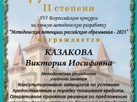 Казакова Виктория Иосифовна заняла 2 место представив разработку учебного занятия "Консультирование заемщиков по условиям предоставления и порядку погашения кредита. Оперативное принятие решения по предложению клиенту дополнительного банковского продукта (кросс-продажа)".