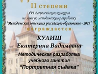 Кулиш Екатерина Вадимовна заняла 2 место представив разработку учебного занятия "Портретная съемка".