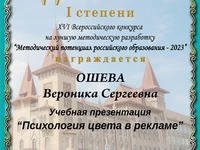 Ошева Вероника Сергеевна заняла 1 место с учебной презентацией "Психология цвета в рекламе".