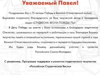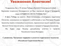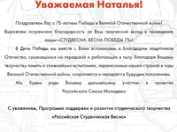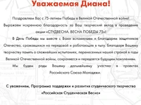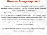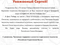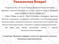 Более одного миллиона зрителей присоединились к онлайн-концерту «Студвесна. Весна Победы 75». В прямом эфире выступили победители и лауреаты Студенческой весны, Хор Турецкого, группа Балаган Лимитед и другие эксперты и гости Программы «Российская Студенческая Весна».