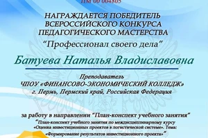 В феврале 2018 года преподаватели Финансово-экономического колледжа Кашина Елена Анатольевна, Сидорова Ольга Александровна, Перина Марина Николаевна, Желтовских Елена Валерьевна и Батуева Наталья Владиславовна приняли участие во Всероссийском конкурсе педагогического мастерства «Профессионал своего дела».  На конкурс преподаватели представили собственные учебно-методические разработки. Работы набрали наивысшее количество баллов в номинациях «План-конспект учебного занятия», «Мультимедийная презентация учебного занятия» и «Учебно-методическое пособие».